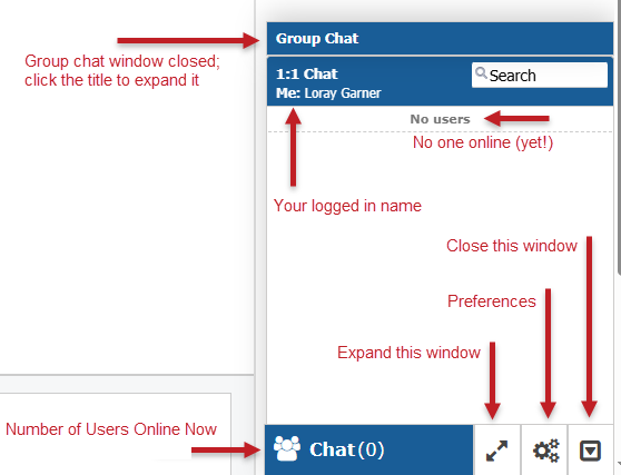 The bottom-right chat window shows whether anyone is online. To open the Group Chat, click on the Group Chat title bar.